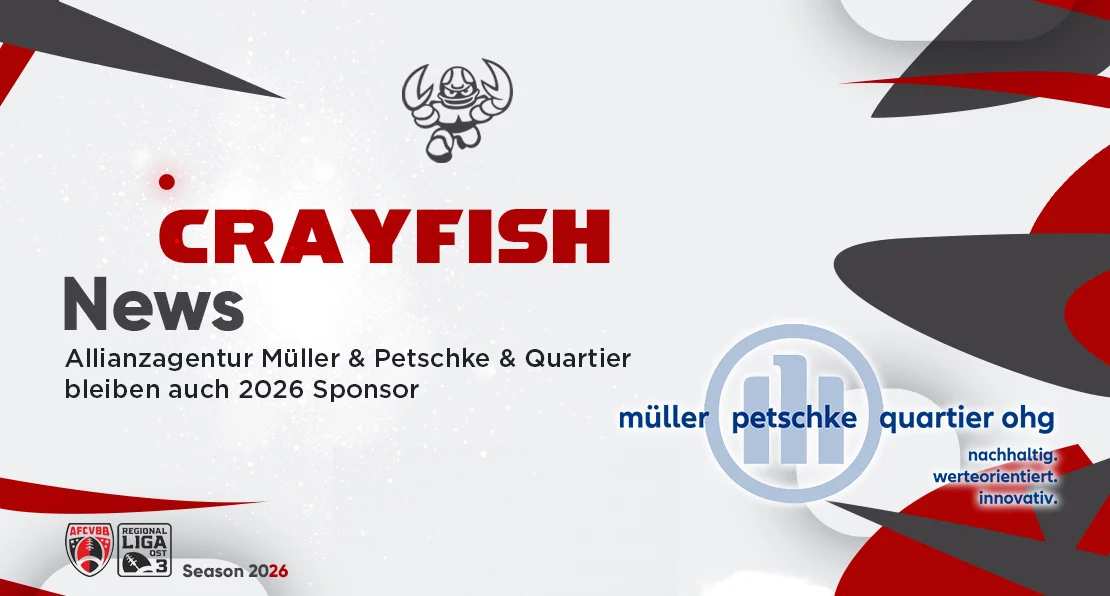 Die Cottbus Crayfish freuen sich, auch für die Saison 2026 eine starke Partnerschaft verkünden zu dürfen: Die Allianzagentur Müller & Petschke & Quartier OHG bleibt weiterhin treuer Sponsor und wichtiger Teil der Crayfish Family!