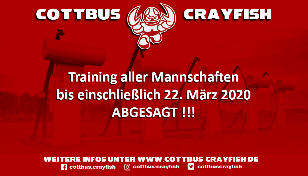 Auf Grund der aktuellen Lage haben die Cottbus Crayfish bis einschliesslich 22.03.2020 vorerst das Training aller Teams eingestellt.Als Gesamtverein haben auch wir gegenüber der Gesellschaft eine Verpflichtung. Auch wenn im Verein bis zum jetzigen Zeitpunkt keine Fälle des Coronavirus bekannt sind, ist die Gefahr der Ansteckung bei einem Kontaktsport wie unserem sehr hoch.