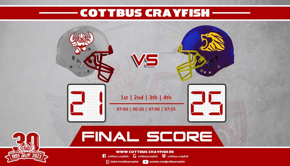 Damit kam erneut die Offense der Gäste aufs Spielfeld die nun durch Run Plays die Zeit herunterspielte und nach 2 erfolgreichen First Downs schließlich mit der Victory Formation das Spiel beendeten konnten. Damit war es nun offiziell und die Cottbus Crayfish verlieren Ihr erstes Spiel der Saison 2023 mit 21:25 gegen die Leipzig Lions, welche bereits in der Vorwoche schon die Spandau Bulldogs geschlagen haben und damit nun voll und ganz ins Titelrennen mit einsteigen.