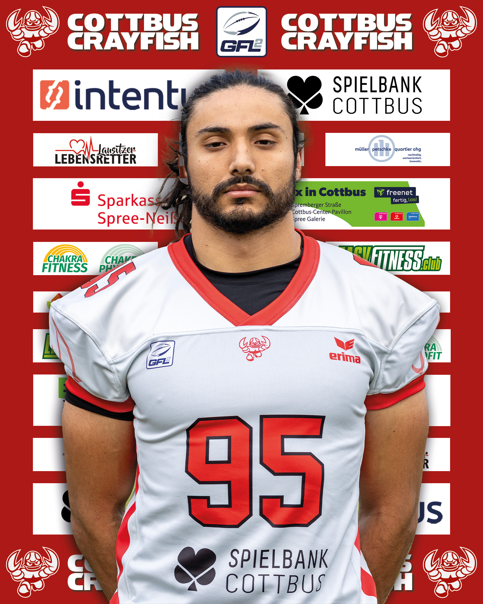 Marco Olivas, der die Nummer 95 trägt, ist ein Importspieler aus den USA und spielte in der Saison alle 10 Spiele der Cottbus Crayfish in der GFL 2. Mit einer Gesamtleistung von 91 Tackles, 1 Interception, 1 Sack, 7,5 Tackles for Loss für insgesamt 45 Yards, 2 Force Fumbles und 1 Fumble Recovery beeindruckte er die gesamte Liga. Besonders hervorzuheben ist seine Konstanz: Mit 11,4 Tackles pro Spiel belegt Marco in der gesamten GFL 2 den zweiten Platz in dieser Kategorie.